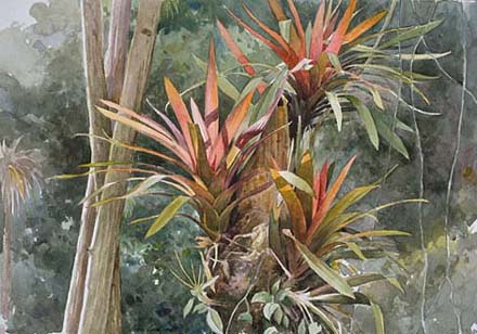 Following Antarctica, my most significant art- science collaboration has been traveling to Costa Rica as a visiting artist with the Organization for Tropical Studies. My first trip included a stay at the Las Cruces Biological Station near the Panama border, where the Wilson Botanical Garden is world famous for its collection of palms, orchids, heliconias and bromeliads. The range of colors in this specimen conjured up the image of botanical fireworks. |